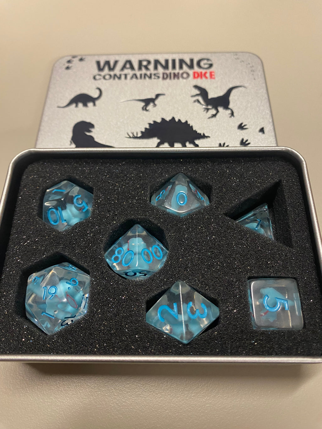 Dinosaur RPG Dice SetUnearth prehistoric power with these dino-themed dice! Each piece is packed with tiny dinosaur figures suspended in crystal-clear resin. Perfect for adventurers who roll with ancient might and Jurassic style.